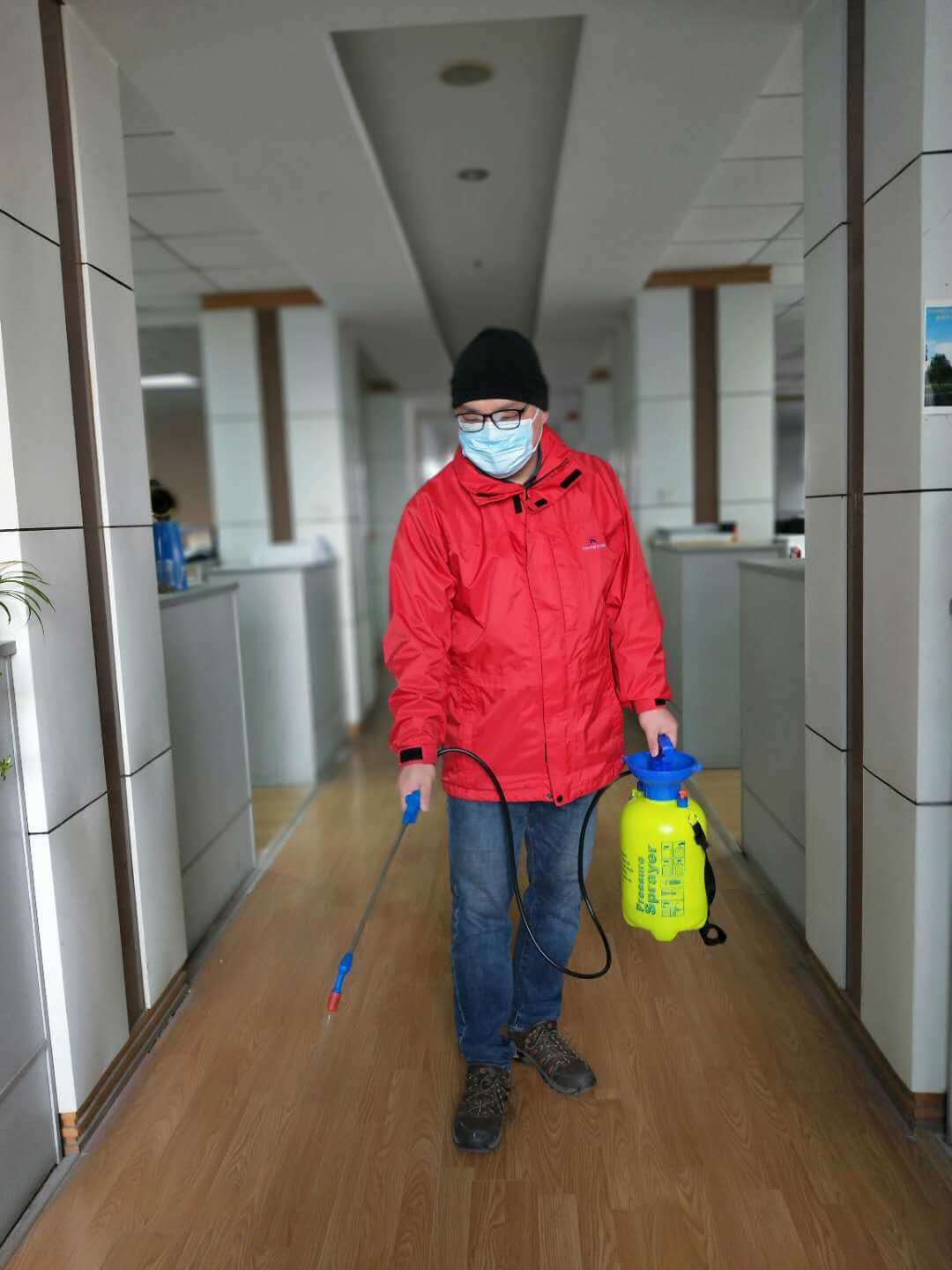 疫情期間黨員同志利用休息時間給辦公室消毒